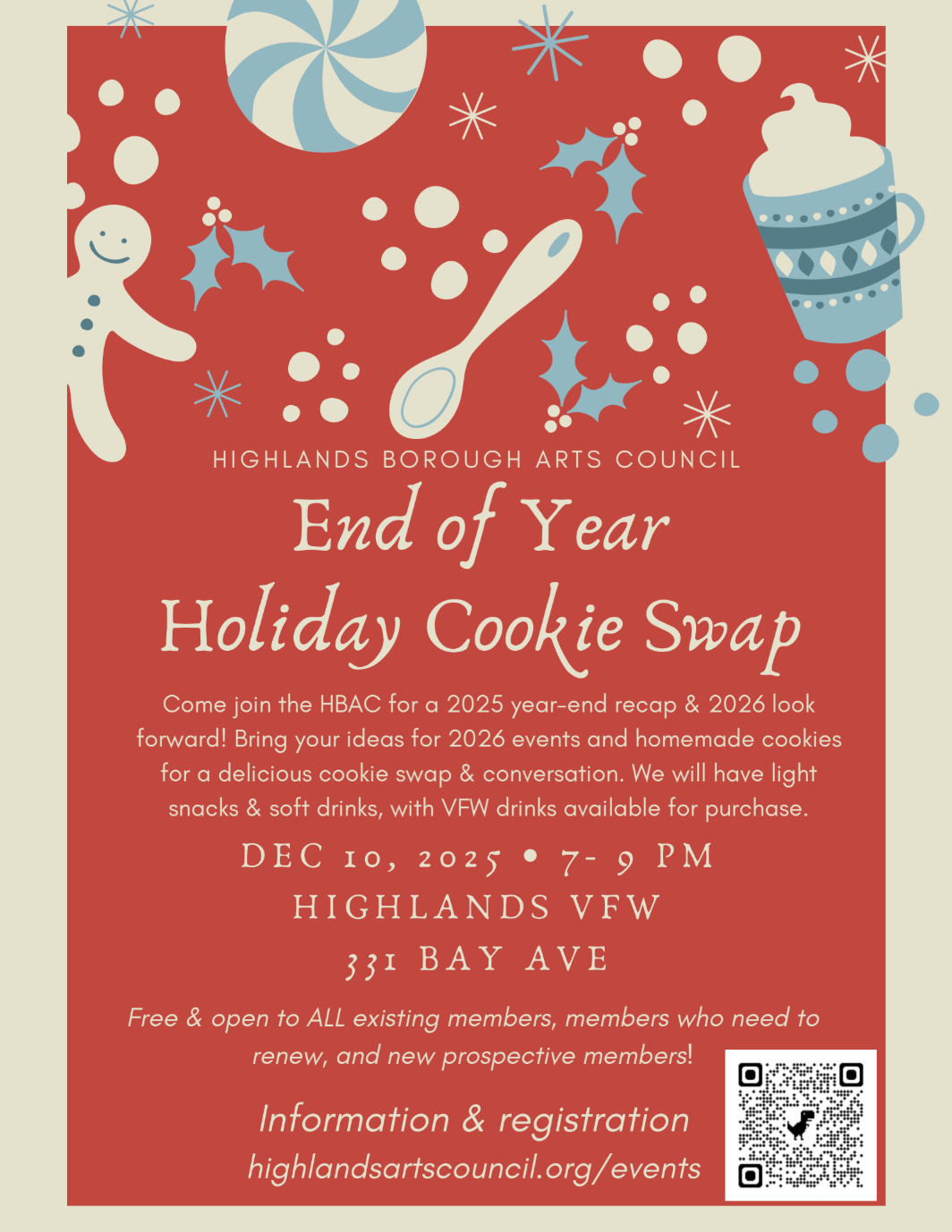 Bring your holiday cheer, 2026 event requests, and cookies (optional) for the end of year Highlands Borough Arts Council Meeting.
